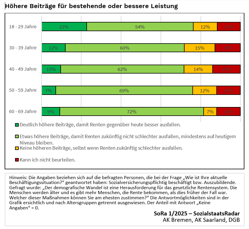 Aufgrund des demografischen Wandels kann eine Erhöhung des Rentenniveaus zwar zu höheren Beiträgen führen. Dies stellt aber für alle Beschäftigten, gerade auch für die heute Jungen, ein gutes Geschäft dar: Für etwas mehr Geld erhalten sie so ein weiterhin sehr leistungsstarkes und krisensicheres „Produkt“, das der Kapitalmarkt nicht liefern kann. Wie die Ergebnisse unseres SozialstaatsRadars 2025 zeigen, sind 63 Prozent der sozialversichert Beschäftigten bereit, etwas höhere Beiträge zu leisten, um die Renten zu sichern. Weitere 12 Prozent sind sogar bereit, deutlich höhere Beiträge zu zahlen, wenn dadurch die Renten steigen. Auffällig ist: Die Jüngeren weisen eine besonders große Bereitschaft auf, deutlich höhere Beiträge für eine gute Rente zu zahlen. Vom häufig beschworenen Generationenkonflikt bei der Finanzierung der Rente kann also keine Rede sein.
