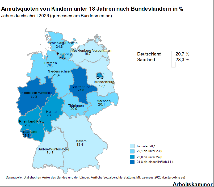 Jedes fünfte Kind wächst in Deutschland in einer Familie auf, in der Mangel herrscht. Kinder im Saarland sind weitaus häufiger von Armut betroffen. Knapp 44.000 Kinder unter 18 Jahre oder 28,3 Prozent aller Kinder lebten 2023 unterhalb der Armutsgrenze. Damit galt an der Saar jedes vierte Kind als arm oder armutsgefährdet. Die aktuellen Krisen und die Preissteigerungen haben die Situation erheblich verschärft. „Wir dürfen die Armut von Kindern im reichen Deutschland nicht länger hinnehmen. Die Bekämpfung von Kinderarmut muss endlich oberste politische Priorität bekommen, fordert Jörg Caspar, der Vorstandsvorsitzende der Arbeitskammer.